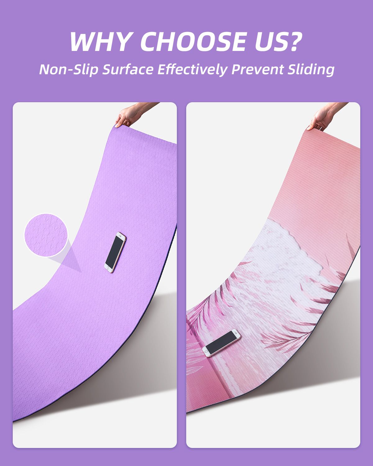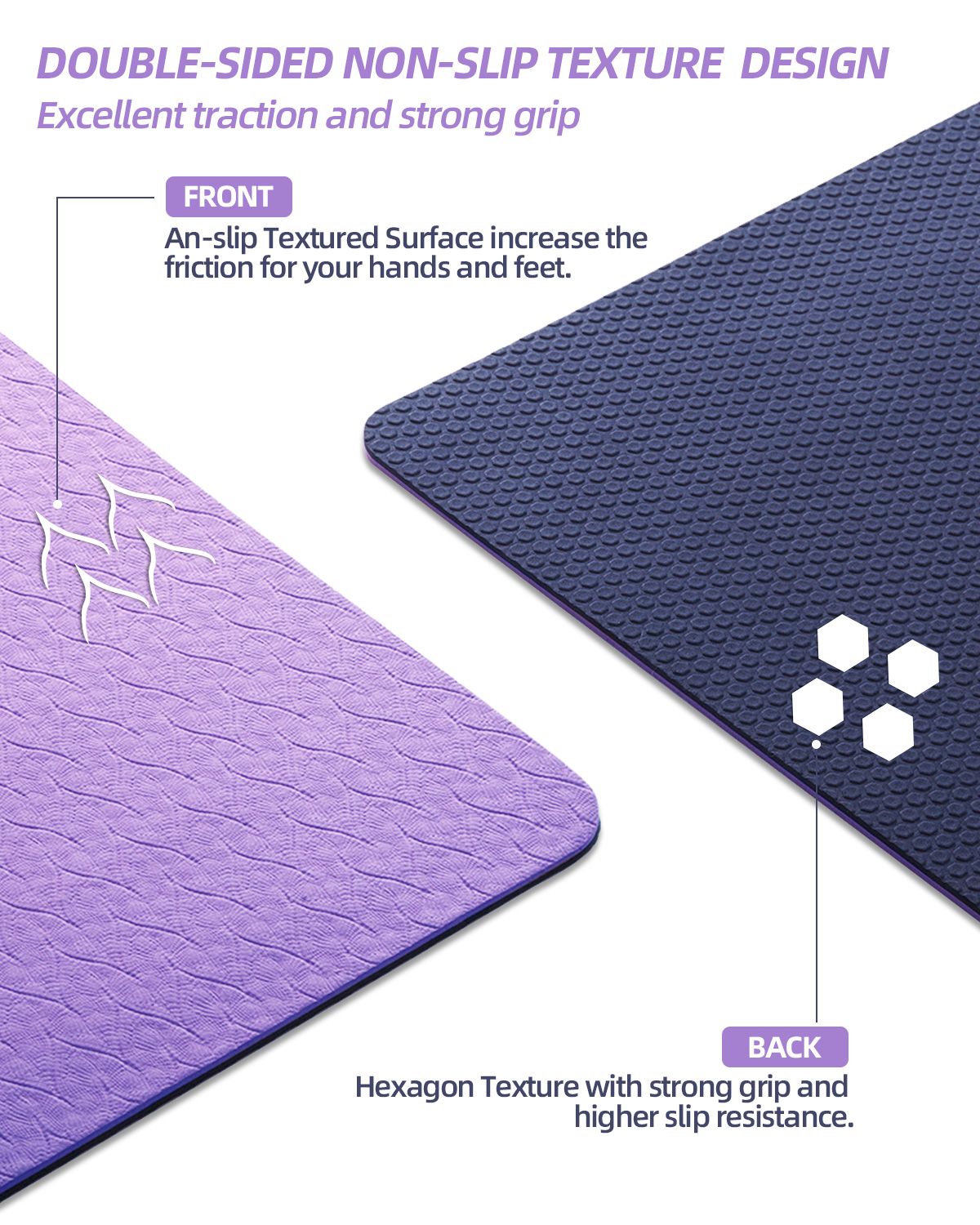The design of anti-skid texture on both sides and Hexagon texture(unique patented non-slip pattern) on the back, features good cushioning and optimal grip. The yoga mat non slip shows the excellent anti-slipping on all kinds of grounds, for example, wood floor, cement floor,tile floor.