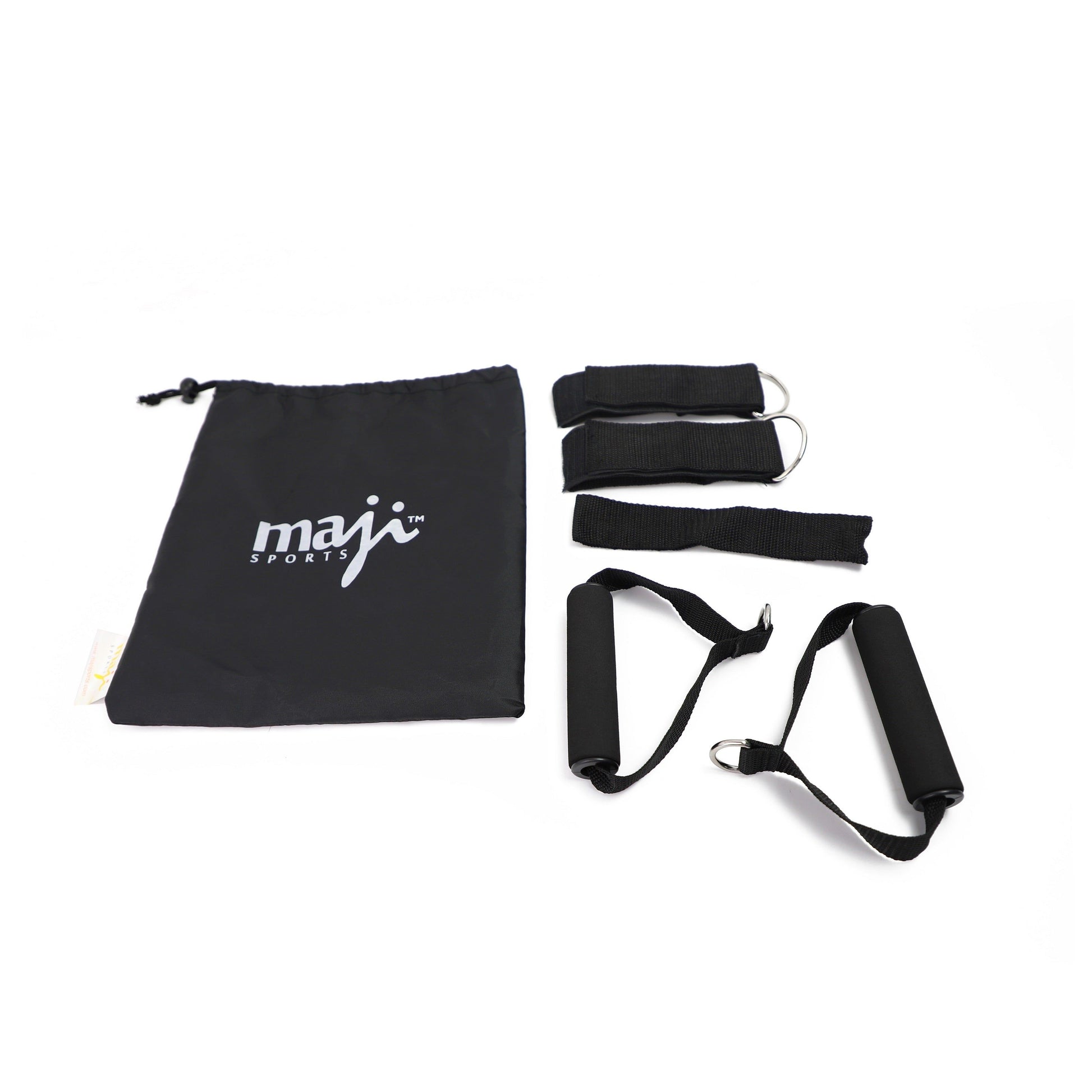 Home/Anywhere Full Body Workout Setup: Whether you are at home or on the go, the choice of staying fit and strong will never be an excuse with the 'FULL BODY WORKOUT MAX RESISTANCE TUBE KIT' setup. This 'Anywhere Full Body Gym' allows you to work on your all major muscle groups in the upper and lower body. The Ultimate All-round Fitness Choice: The perfect choice for a complete all-round fitness workout that includes strength, muscle gains, toning, flexibility and mobility. Durable & Light Weight: Good quality, tested resistance bands. The metal fittings attached to different components ensure safety and durability of the entire setup. Easy to Carry: A 11 component setup that can be easily carried in a carry bag provided with the product. Light weight and specially designed portable setup make this product a very convenient choice for storage & to move around with. Easy to Assemble: Easy carabiner attachment function and metal rings make it a fast & easy to assemble setup to begin your workout in no time. Ideal for Door-Workout: The option of using a door anchor adds to the versatility of using this product for door-based exercises like a Chest Press. From Beginner to advance level: Five levels of resistance bands (yellow/10 lbs, red/15 lbs, blue/20 lbs, green/ 25 lbs, black/ 30 lbs) included to increase the intensity & effectiveness of your workout as you make progress or just want to increase the intensity. You can also combine the resistance bands to achieve a max resistance level of 100 lbs. What do you get: 5 pcs colour coded resistance bands with carabiners on both ends (yellow/10 lbs, red/15 lbs, blue/20 lbs, green/ 25 lbs, black/ 30 lbs), 2 pcs handles, 2 pcs ankle straps, 1 pc door anchor, 1 pc carry bag with an instruction manual (full body workout routine)