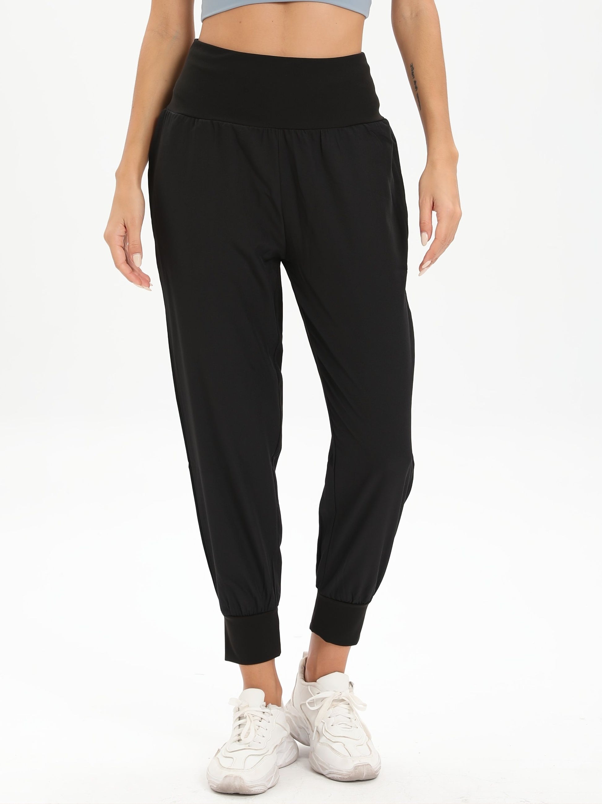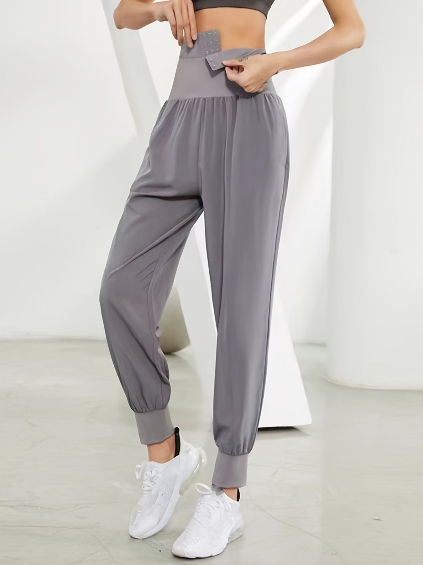 Solid Color High Waist Yoga Fitness Cropped Pants, Breasted Waist Straps Sports Jogging Pants, Women's Activewear