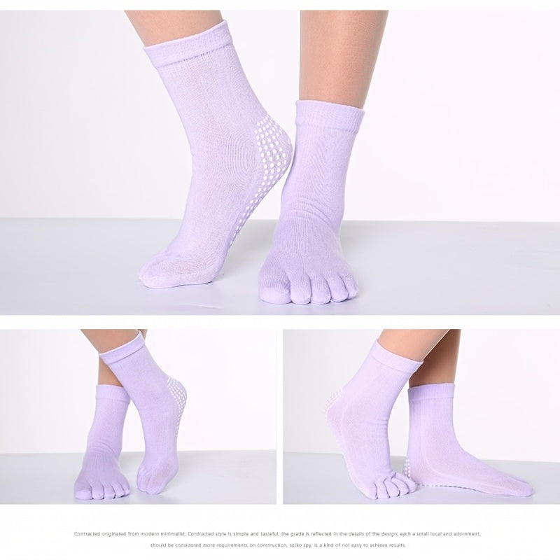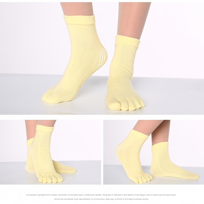 1pair Rainbow Color Non-slip Towel Bottom Yoga Socks, Cozy 5 Toes Split Knitted Calf Crew Socks, Women's Yoga Socks