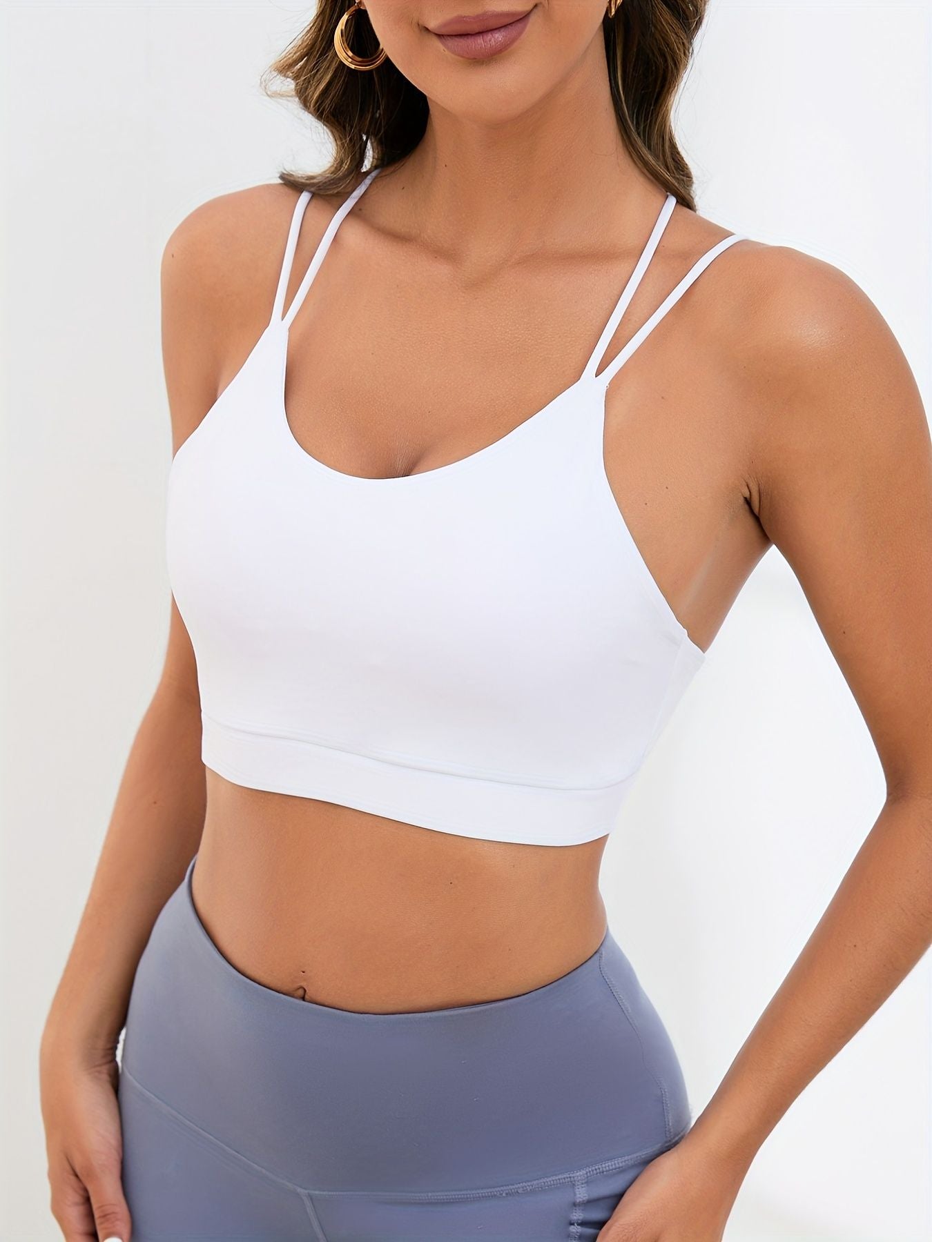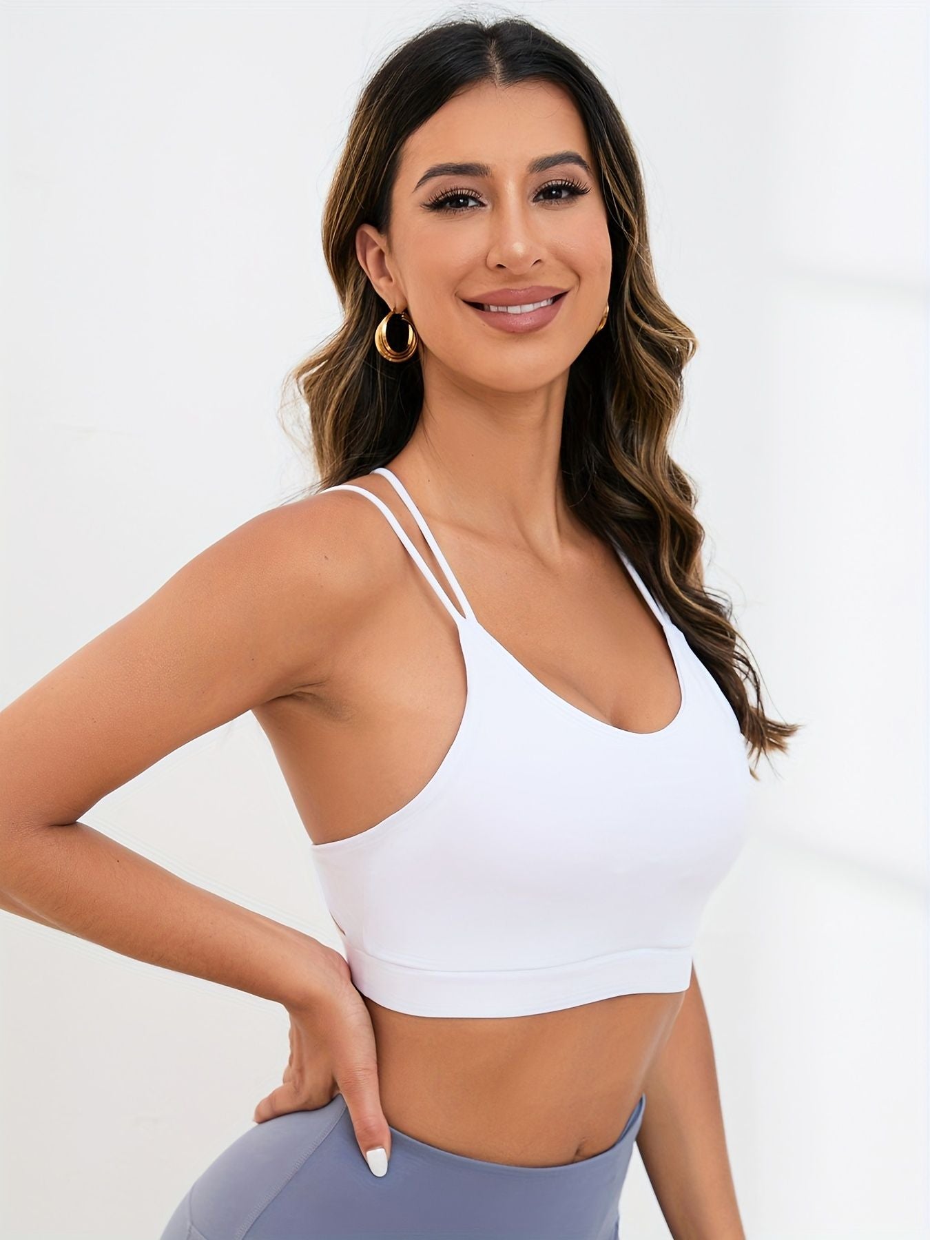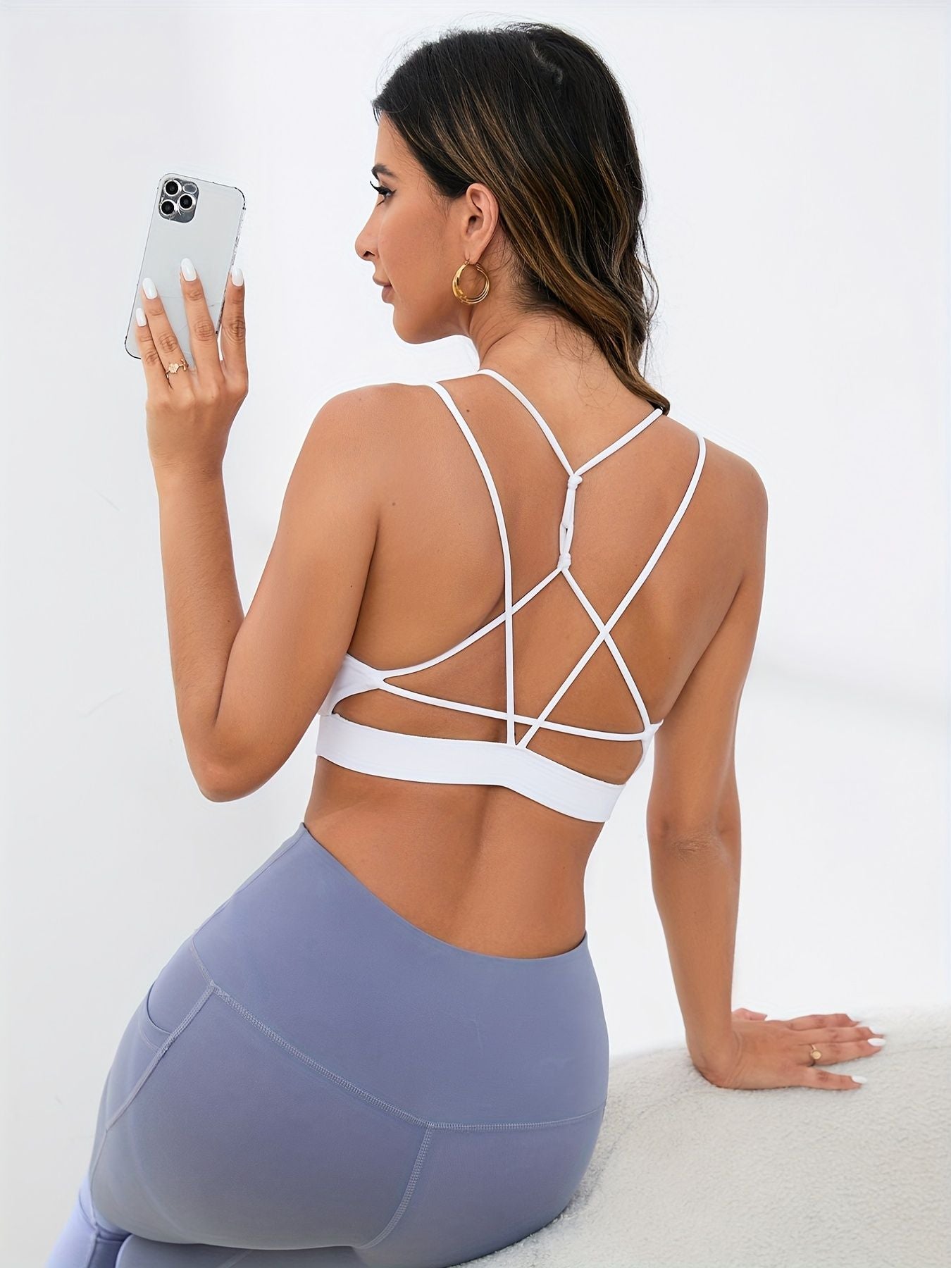 White Double Strap U-neck Sports Bra, Criss Cross Backless Tie Knot Fashion Yoga Fitness Workout Tank Top, Women's Activewear